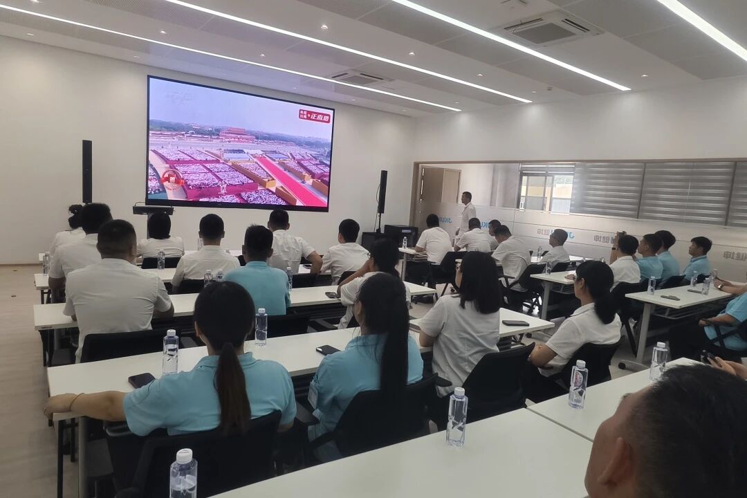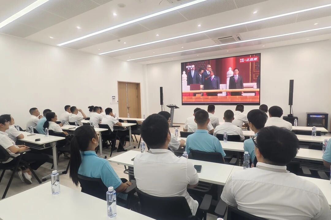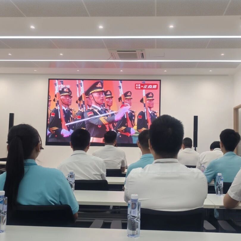 盛大阅兵仪式按阅兵式、分列式进行,历时约70分钟。员工们全神贯注地观看直播,不时发出赞叹之声。人民军队的威武雄壮展示了我国的军事实力和维护国家主权、领土完整的坚定决心,更彰显了中国作为世界和平的坚定维护者的责任担当。